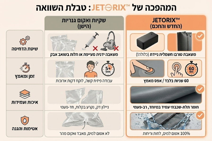 "בתור אחד שקנה הרבה שקיות ואקום בעלי אקספרס שנקרעו אחרי שימוש אחד - JETORIX זה ליגה אחרת. החומר עבה בטירוף, הרוכסן כפול וחזק, וזה שרד טרקים וזריקות של מזוודות בשדות תעופה בלי שום שריטה. שווה כל שקל."